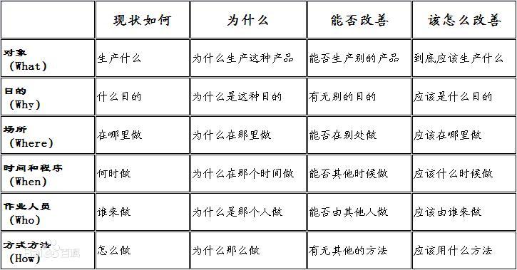 5W1H分析法也称六何分析法,是一种思考方法,也可以说是一种创造技法。是对选定的项目、工序或操作,都要从原因(WHY)、对象(WHAT)、地点(WHERE)、时间(WHEN)、人员(WHO)、方法(HOW)等六个方面提出问题进行思考。这种看似很可笑、很天真的问话和思考办法,可使思考的内容深化、科学化。